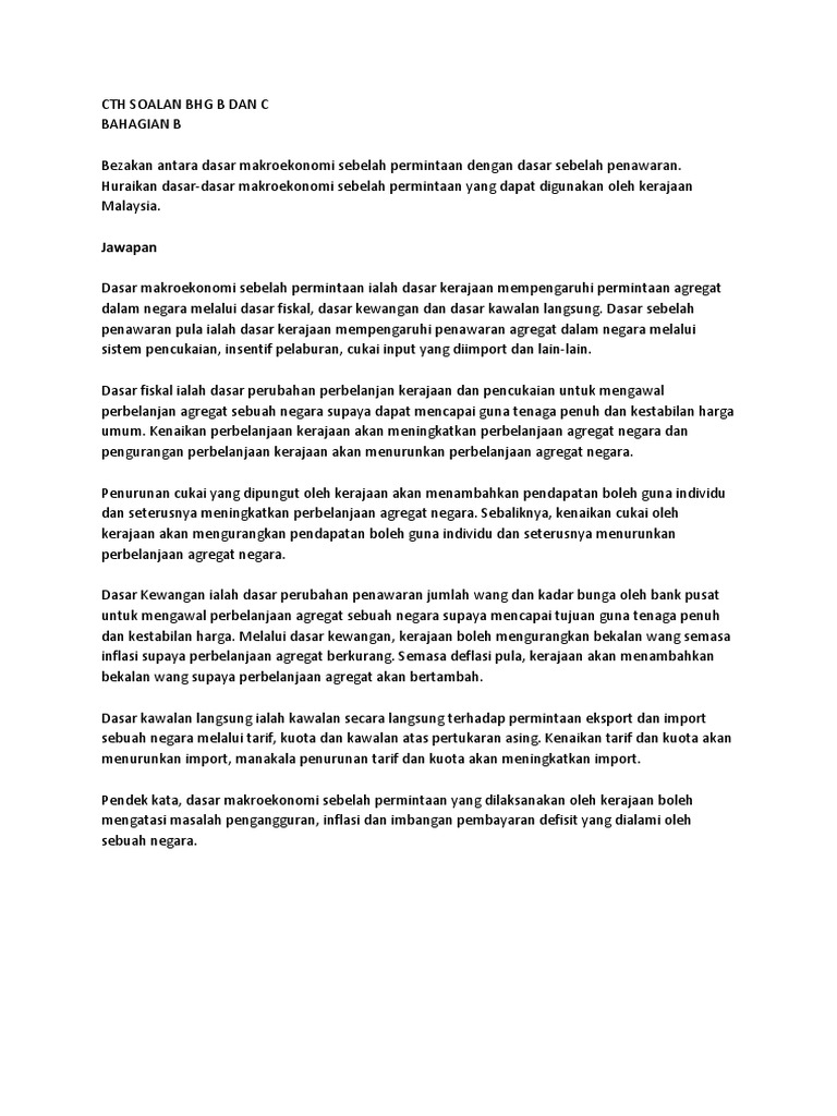 Soalan 1. KOLEKSI SOALAN ESEI JAWAPAN EKONOMI 2 STPM 1. Dasar makroekonomi sebelah permintaan ialah dasar kerajaan mempengaruhi permintaan agregat dalam neg a ra melalui dasar fiskal dasar kewangan dan dasar kawalan langsung.